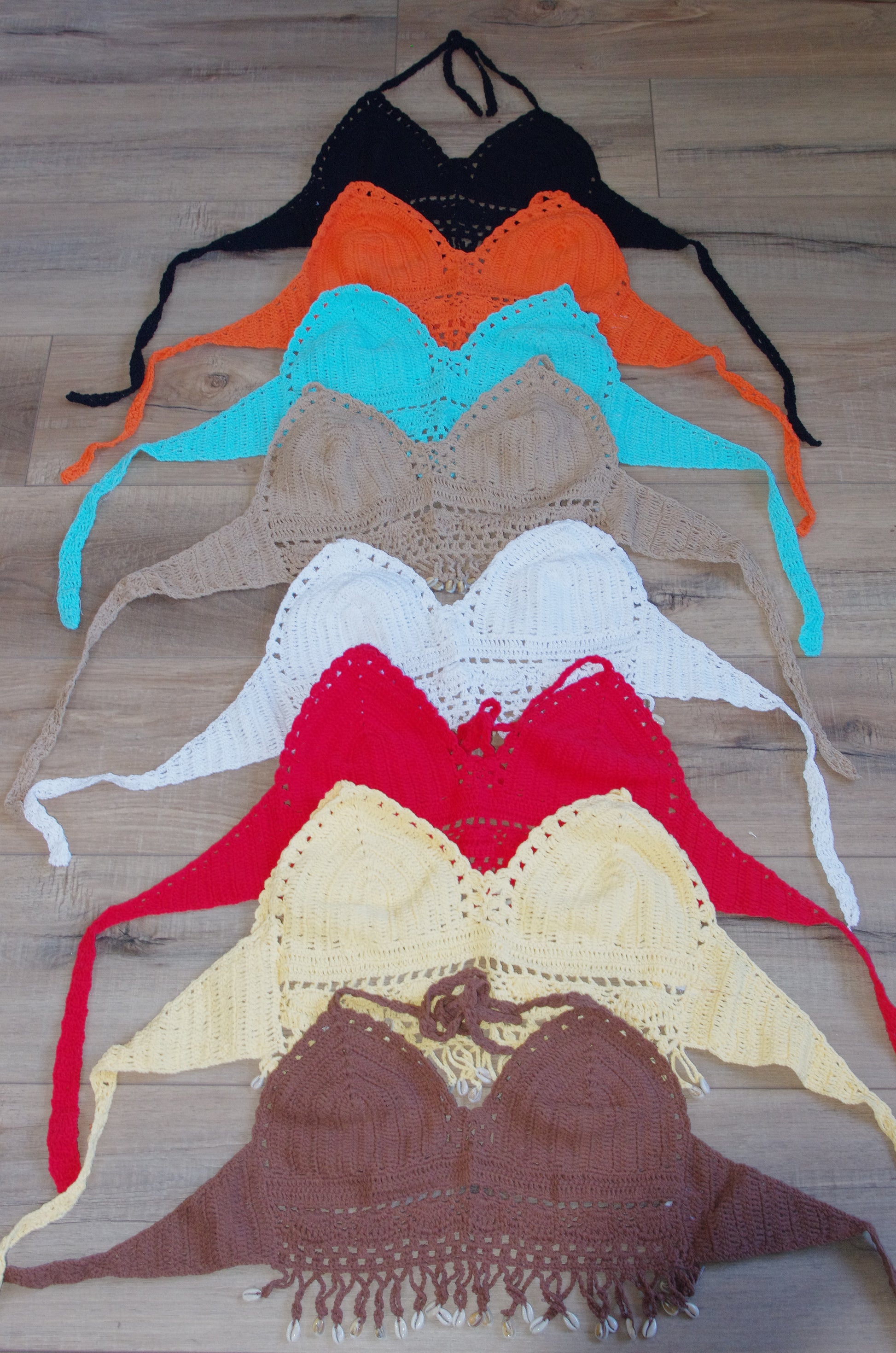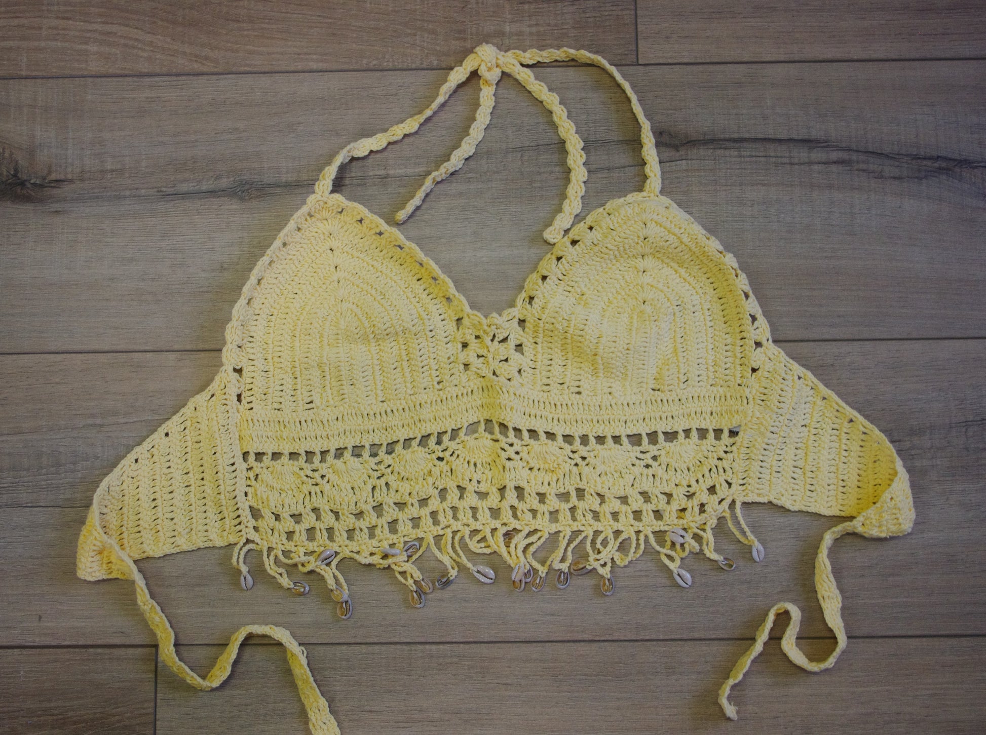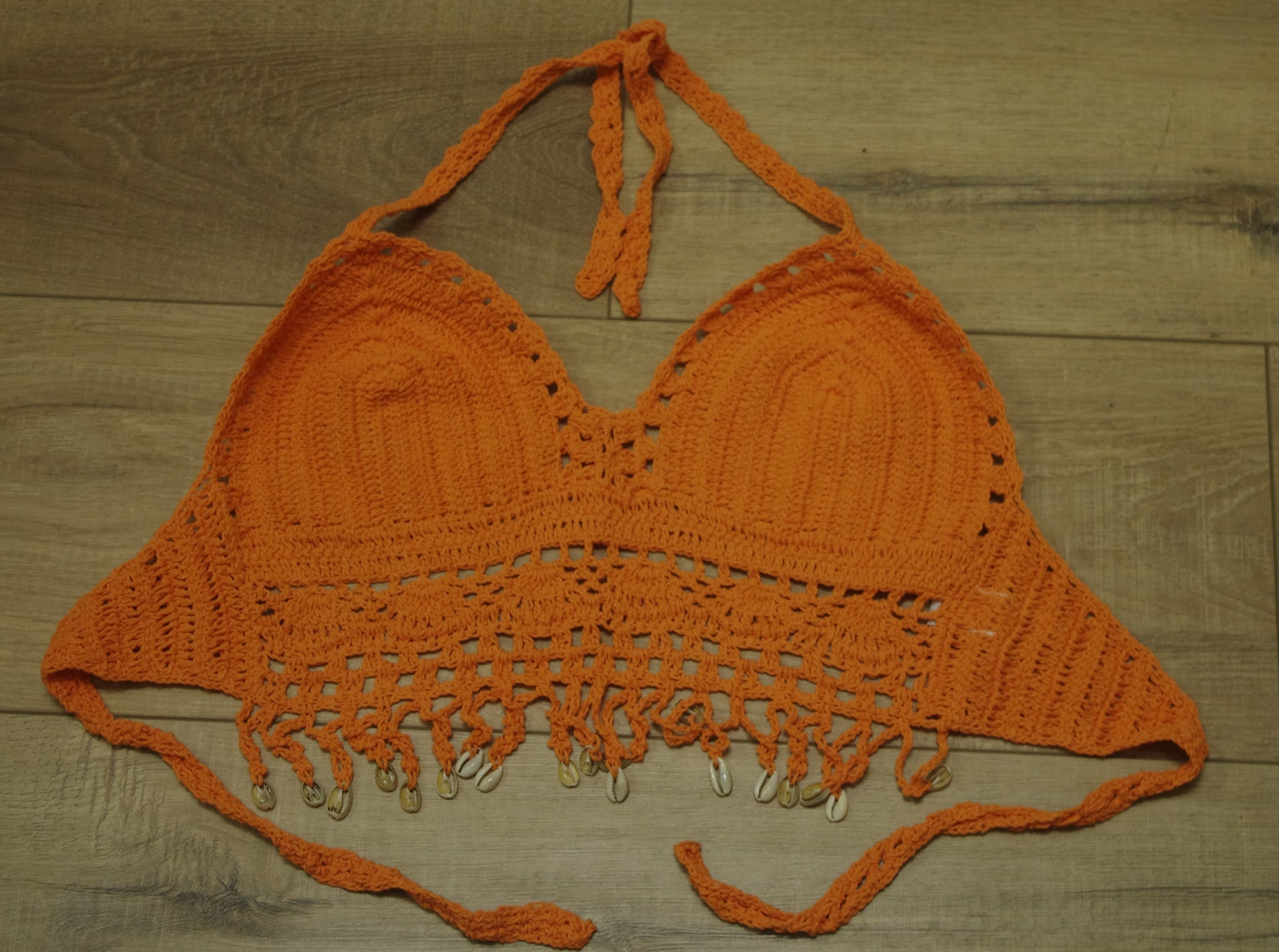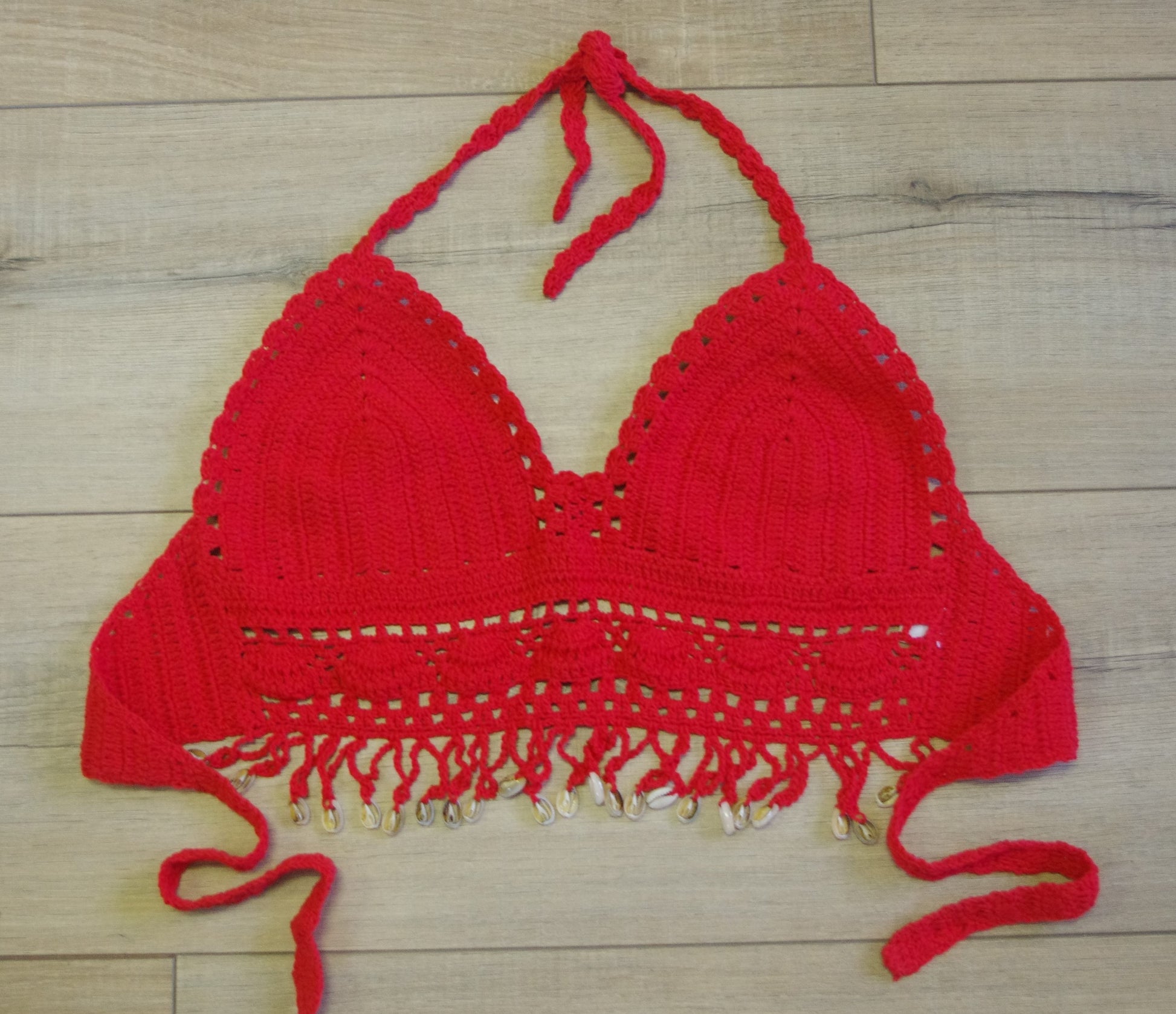 Hand Crochet Belly CROP with v front and shells hanging along the belly with a crochet strap to tie at the back.