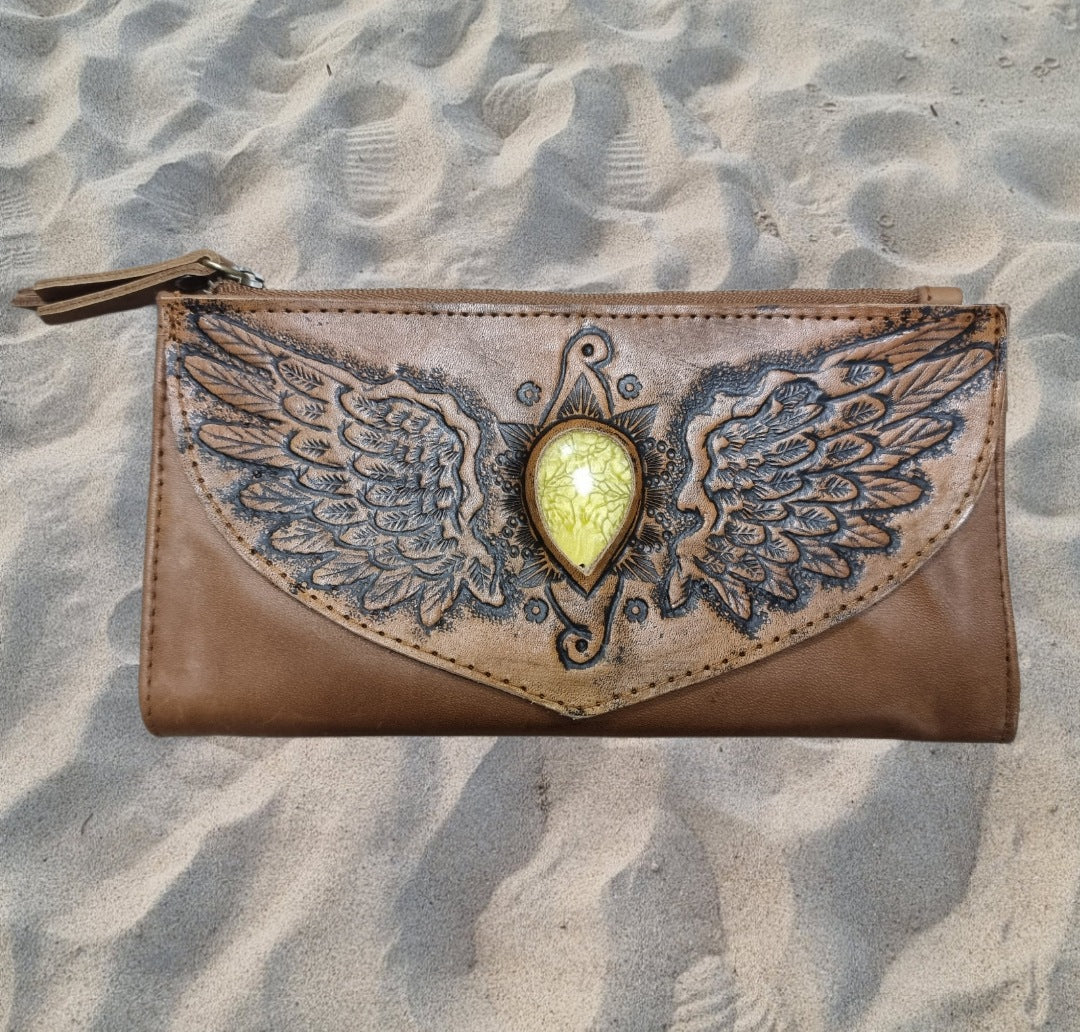 100% Handmade, hand carved, brown leather purse with eagle wings & a yellow stone.