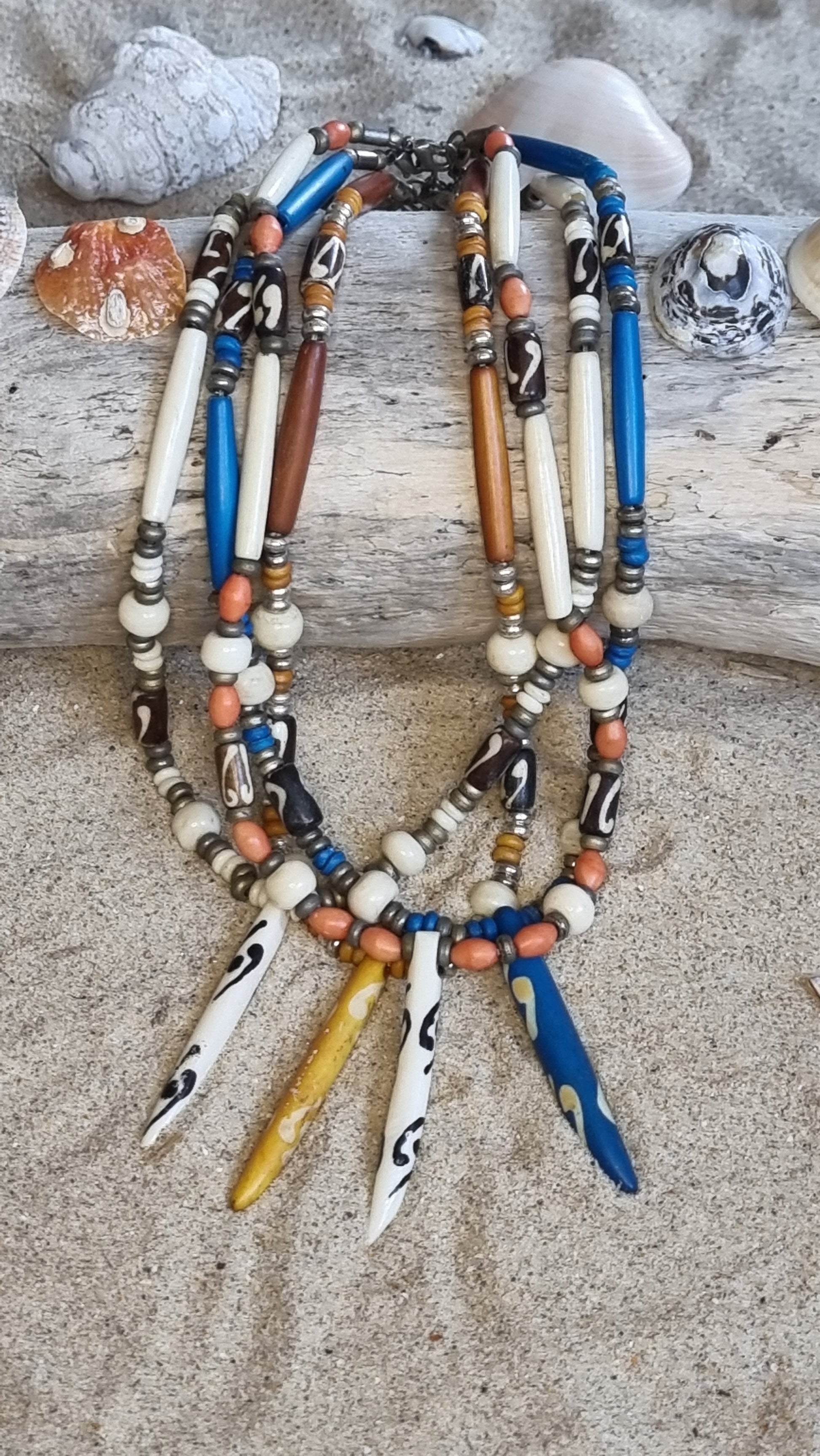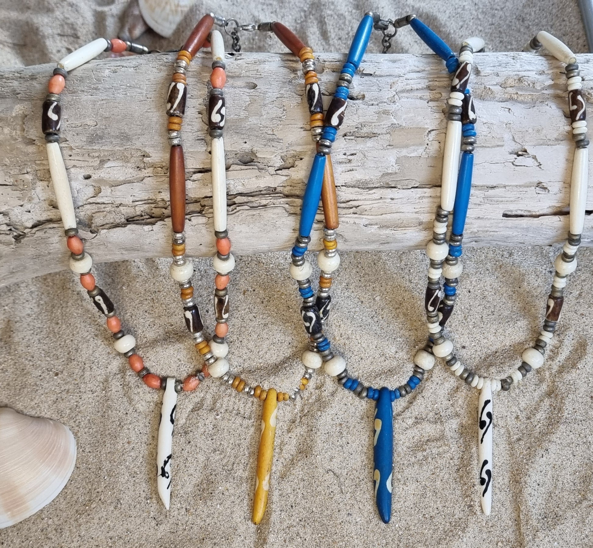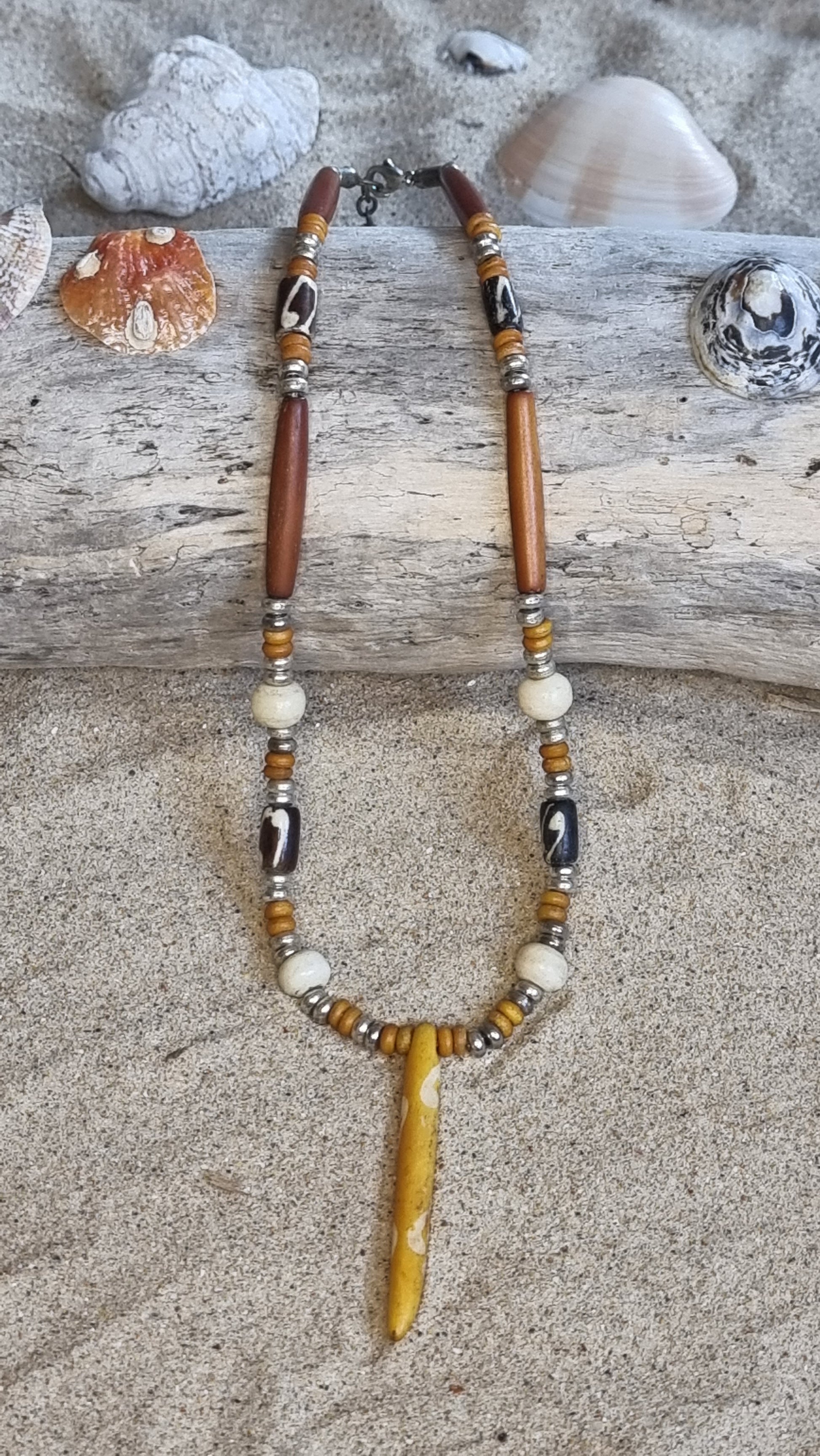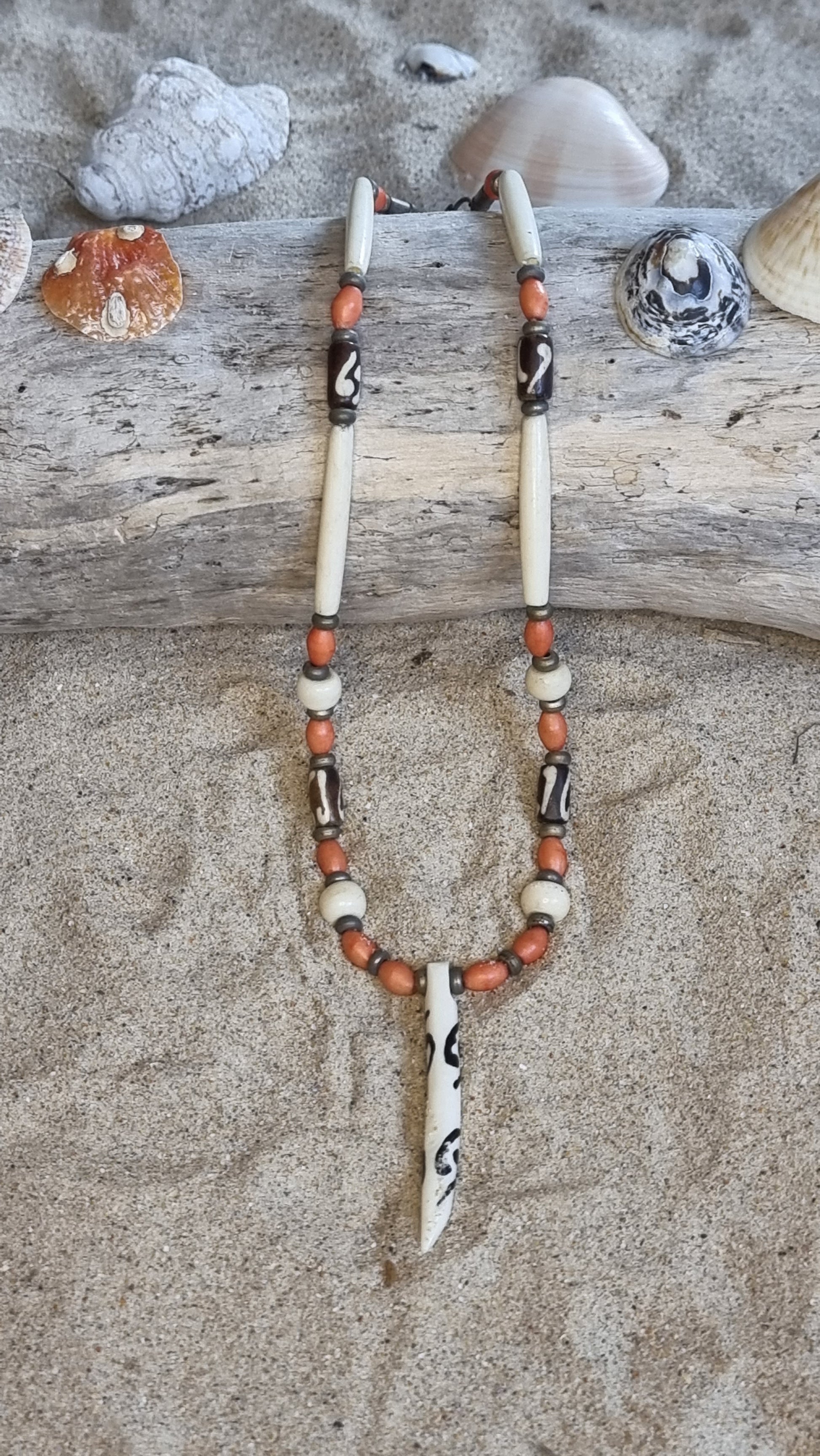 - Bone and metal necklace, with cotton thread and a silver, metal, lobster clasp closure.