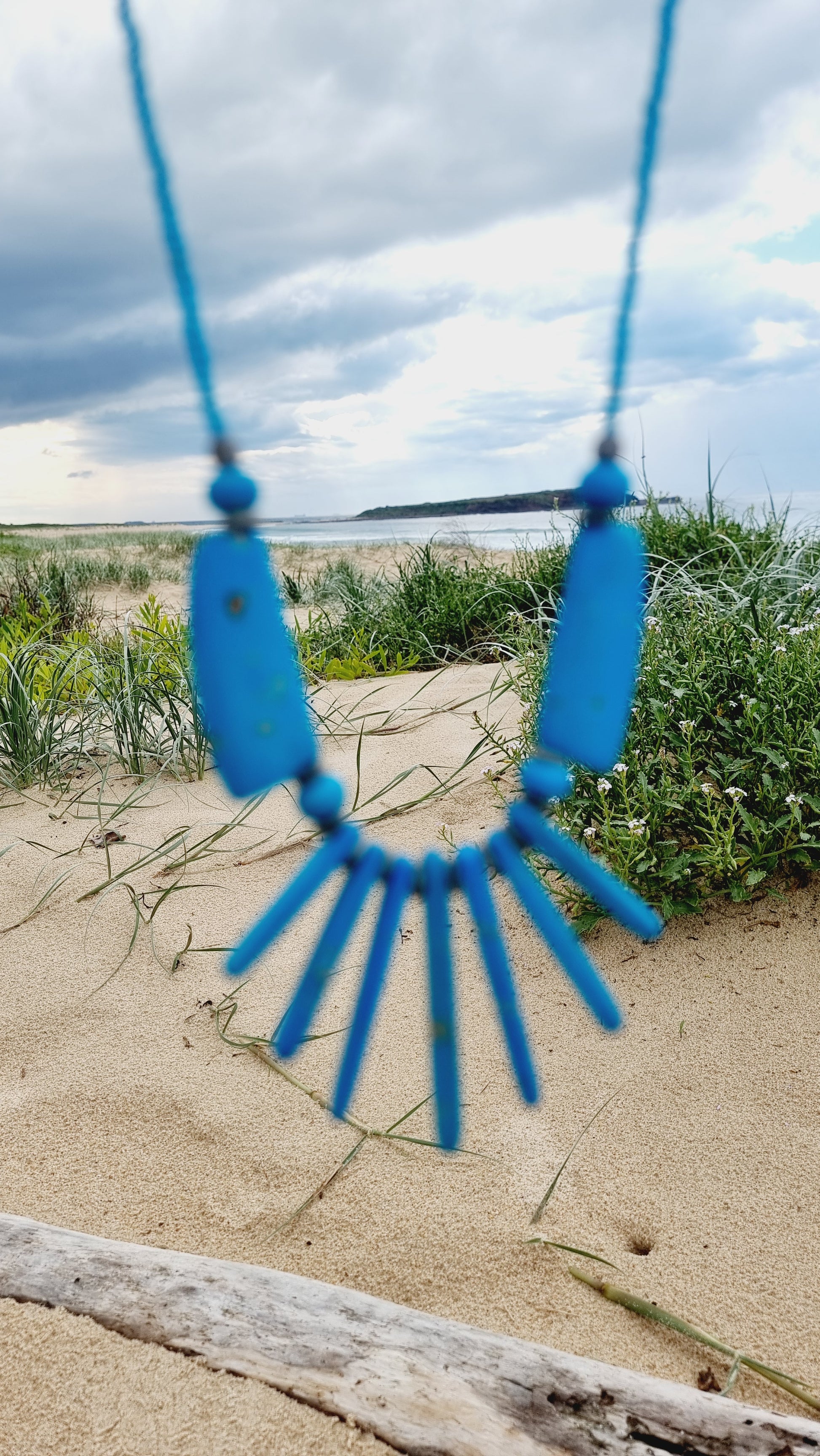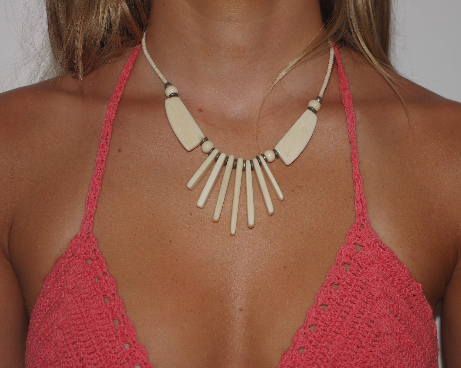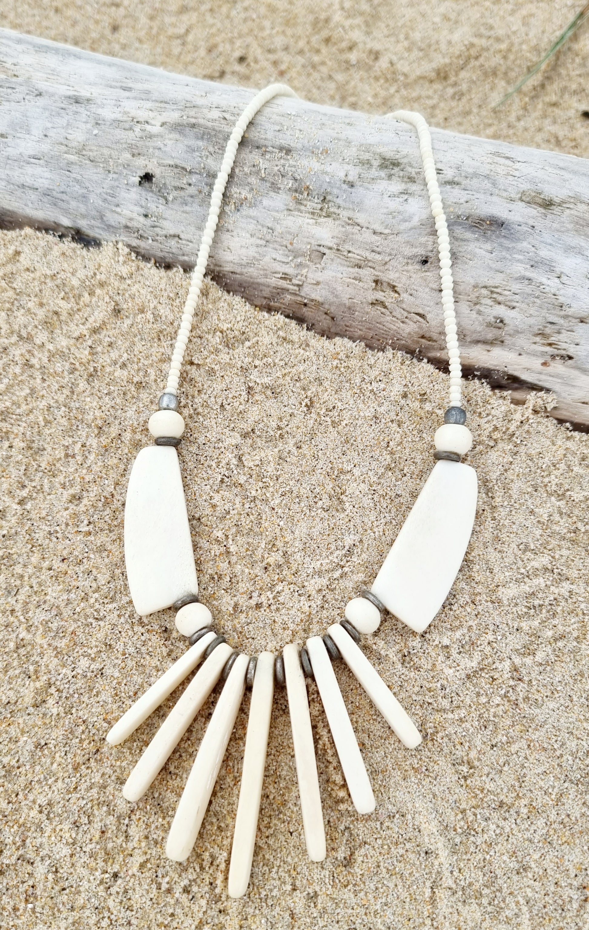 - Bone necklace, with cotton thread and a silver, metal, lobster clasp closure.