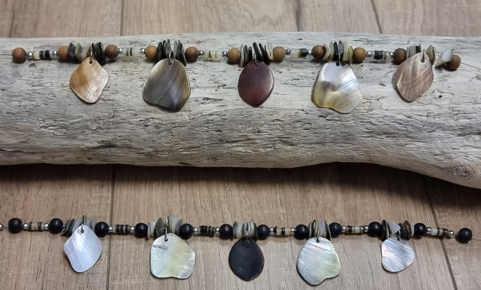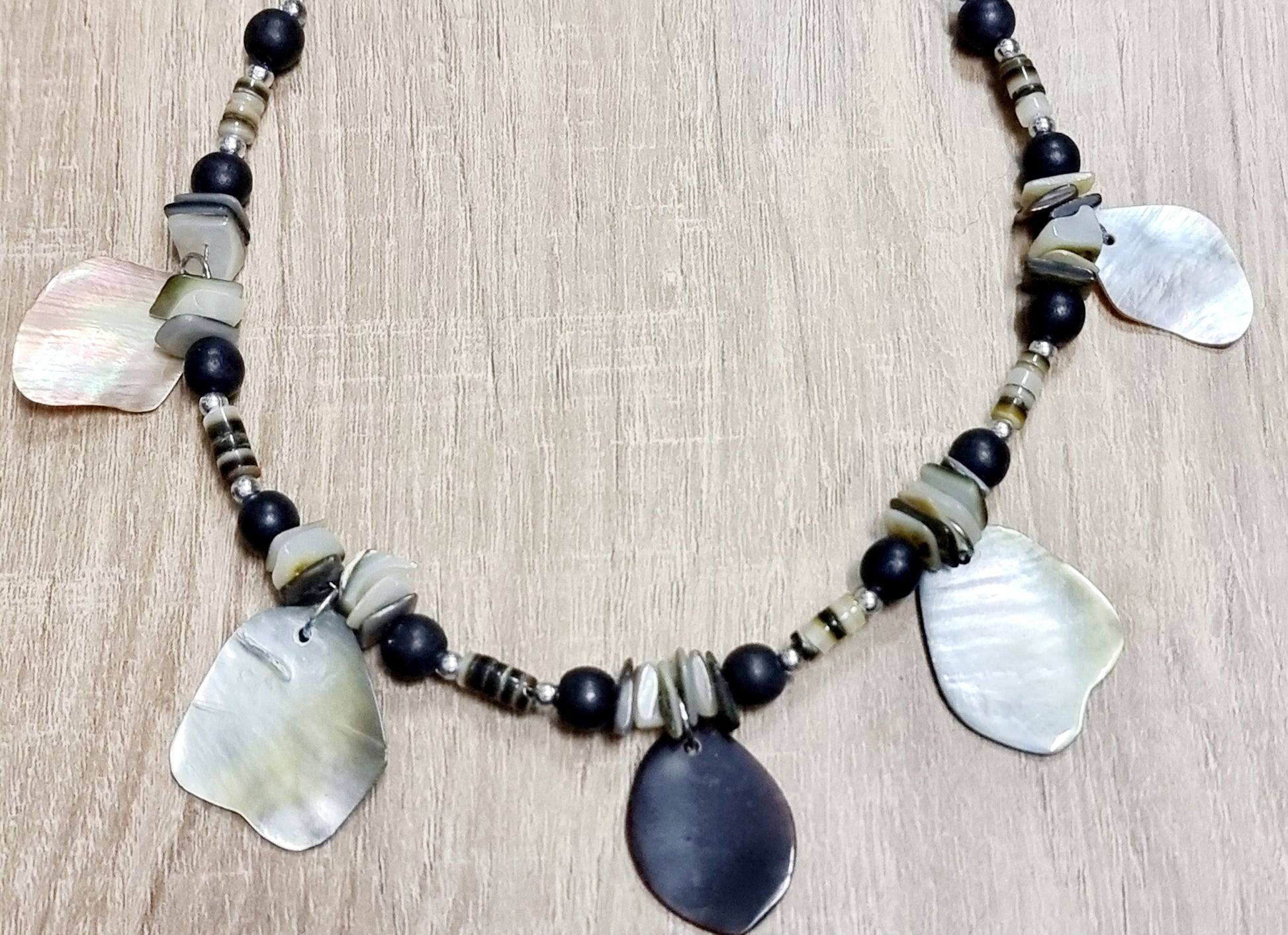 - Black Lip Shell Necklace on wire thread chain and a silver, metal, round clasp closure.