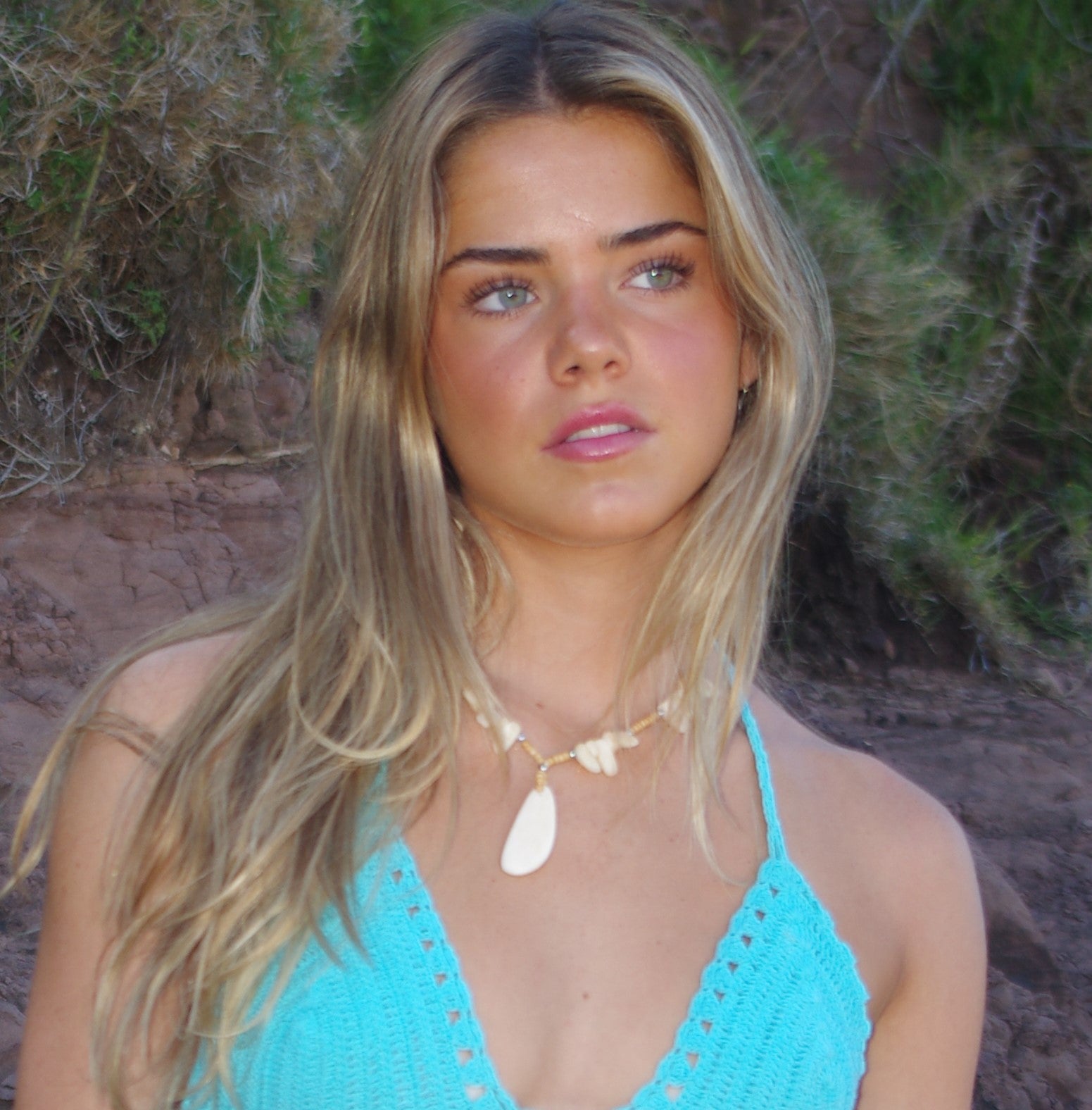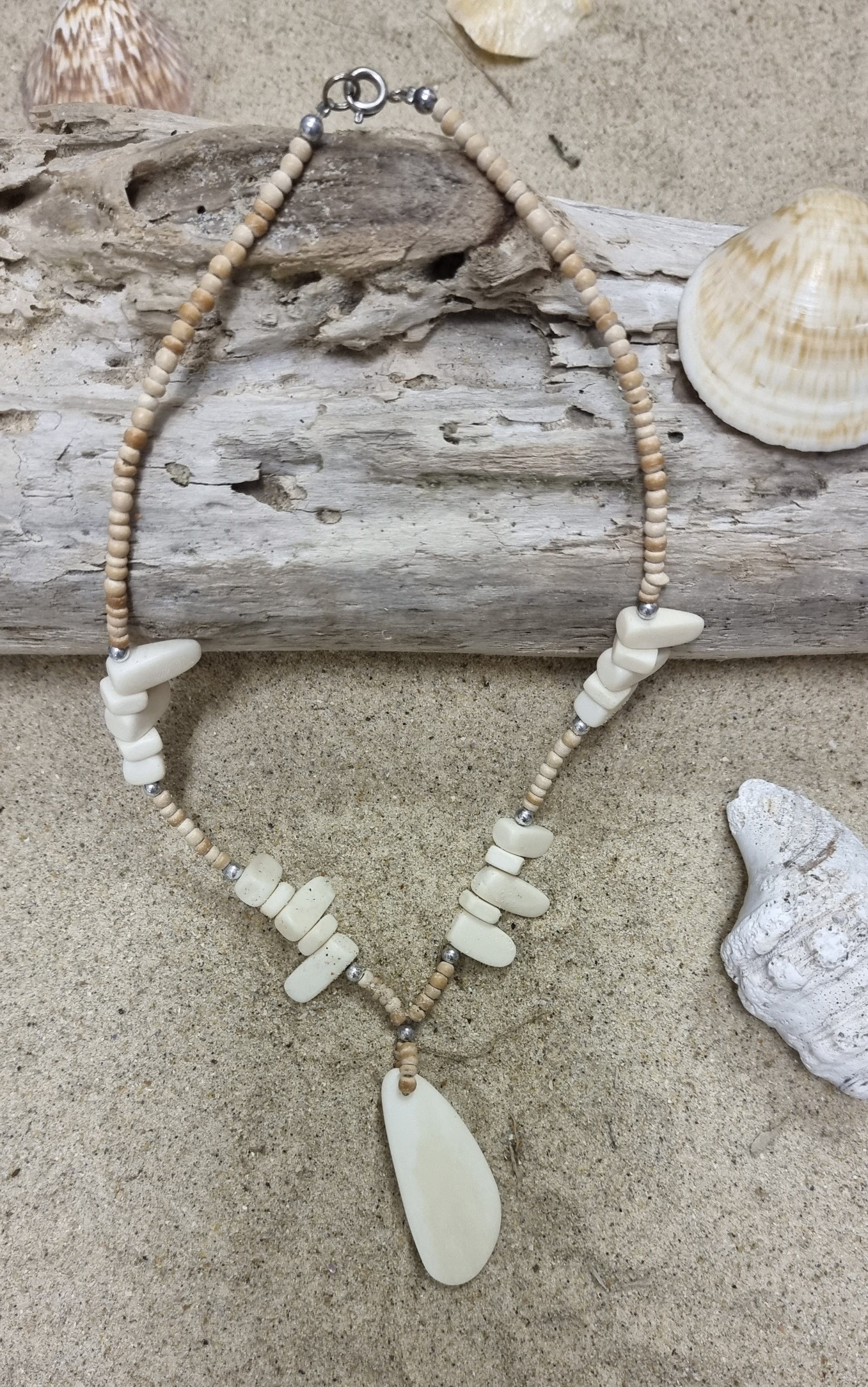 - Bone Pendant, wood and bead chain, on fishing line thread and a silver, metal, round clasp closure.