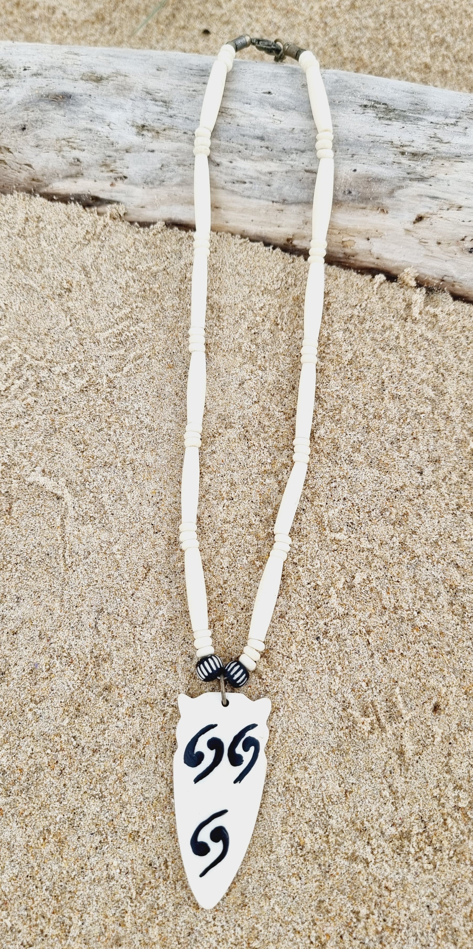 - Bone Pendant with Yin yang 69 design, bone tube bead chain, with Strong Cotton thread and a silver, metal, lobster clasp closure.