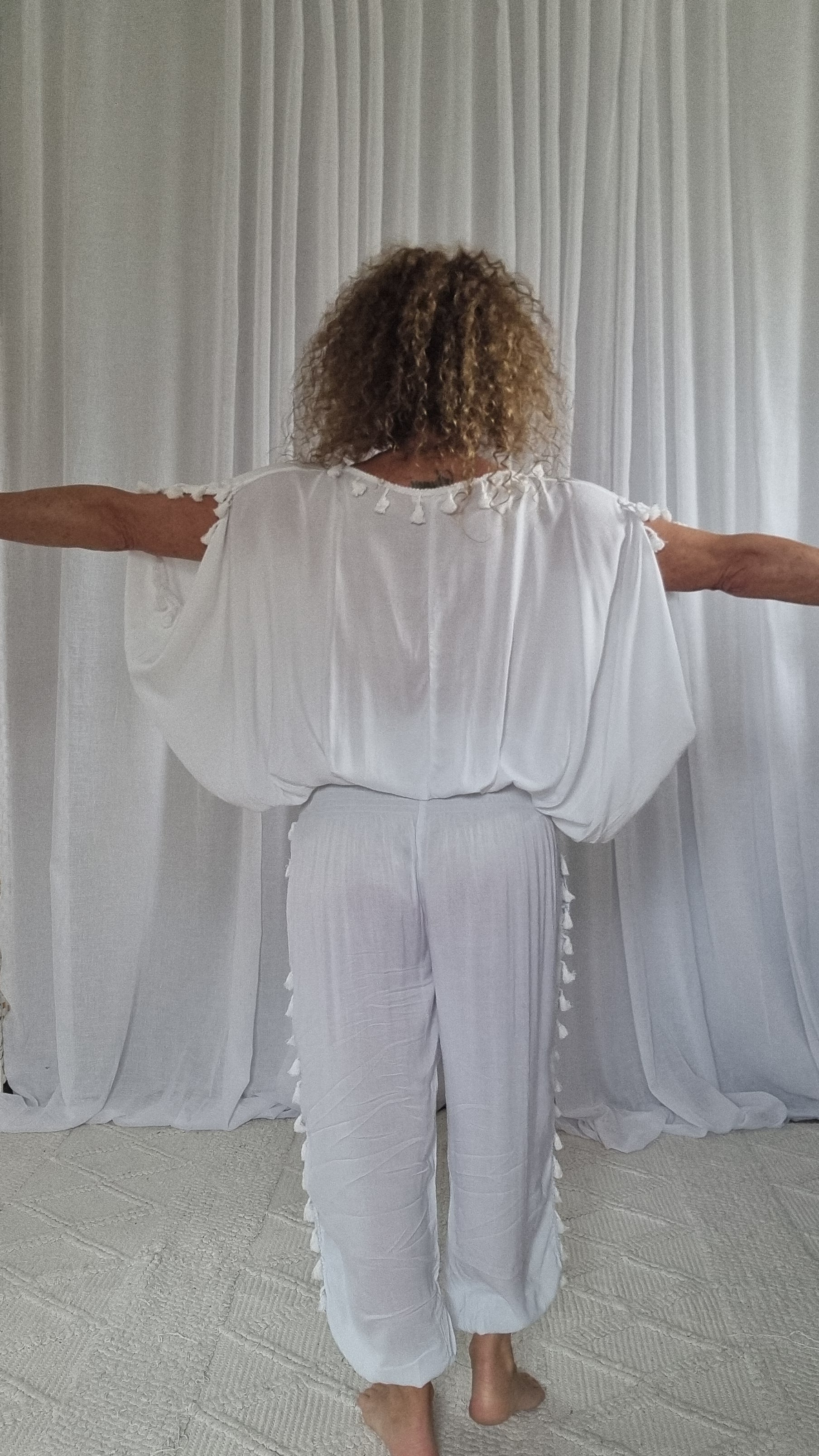 These sets are handmade from rayon material, which is a soft light fabric, great for warmer months and easy to iron. Tassels line the neck, sleeves, outer legs and the front of the pants.