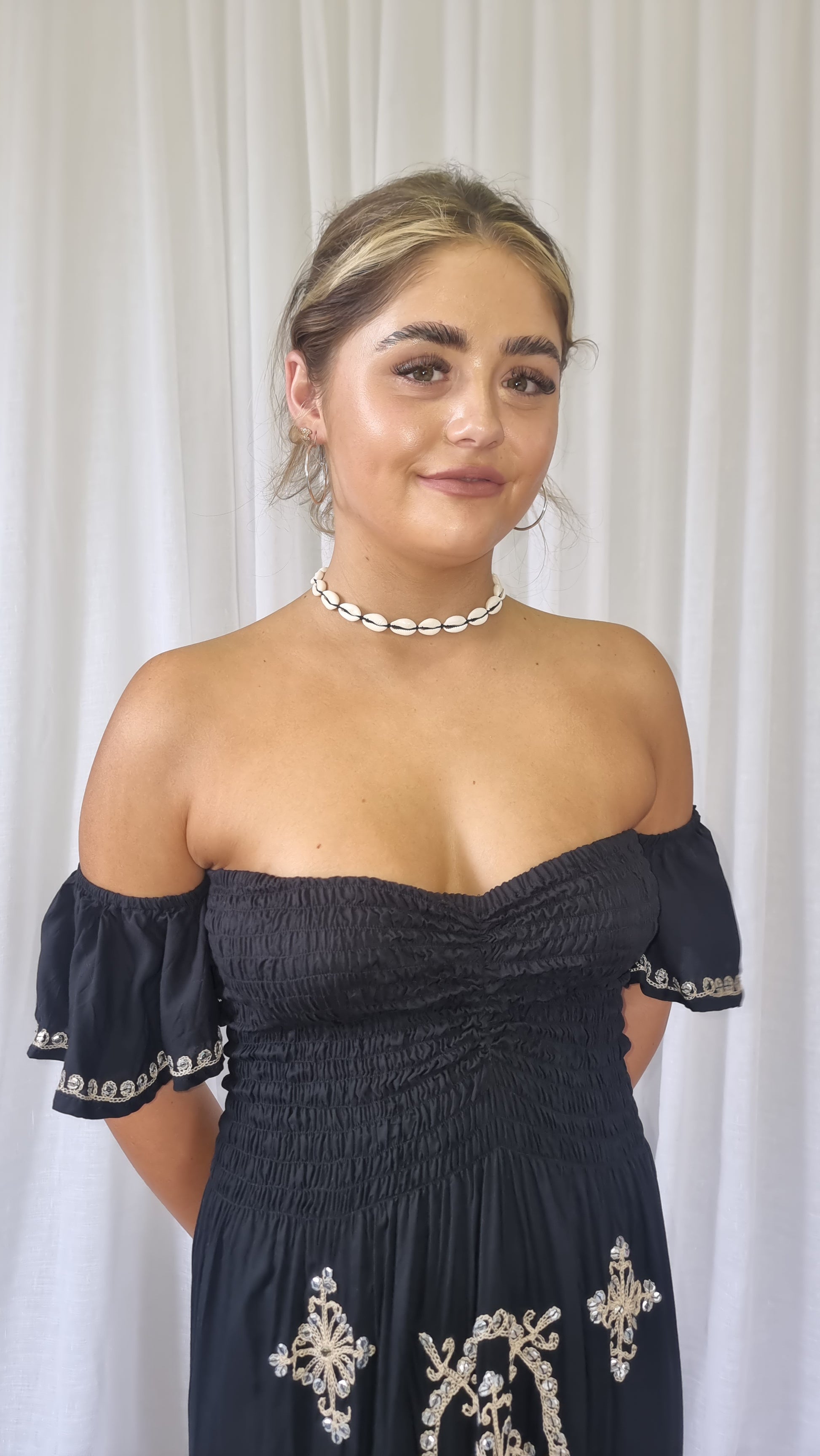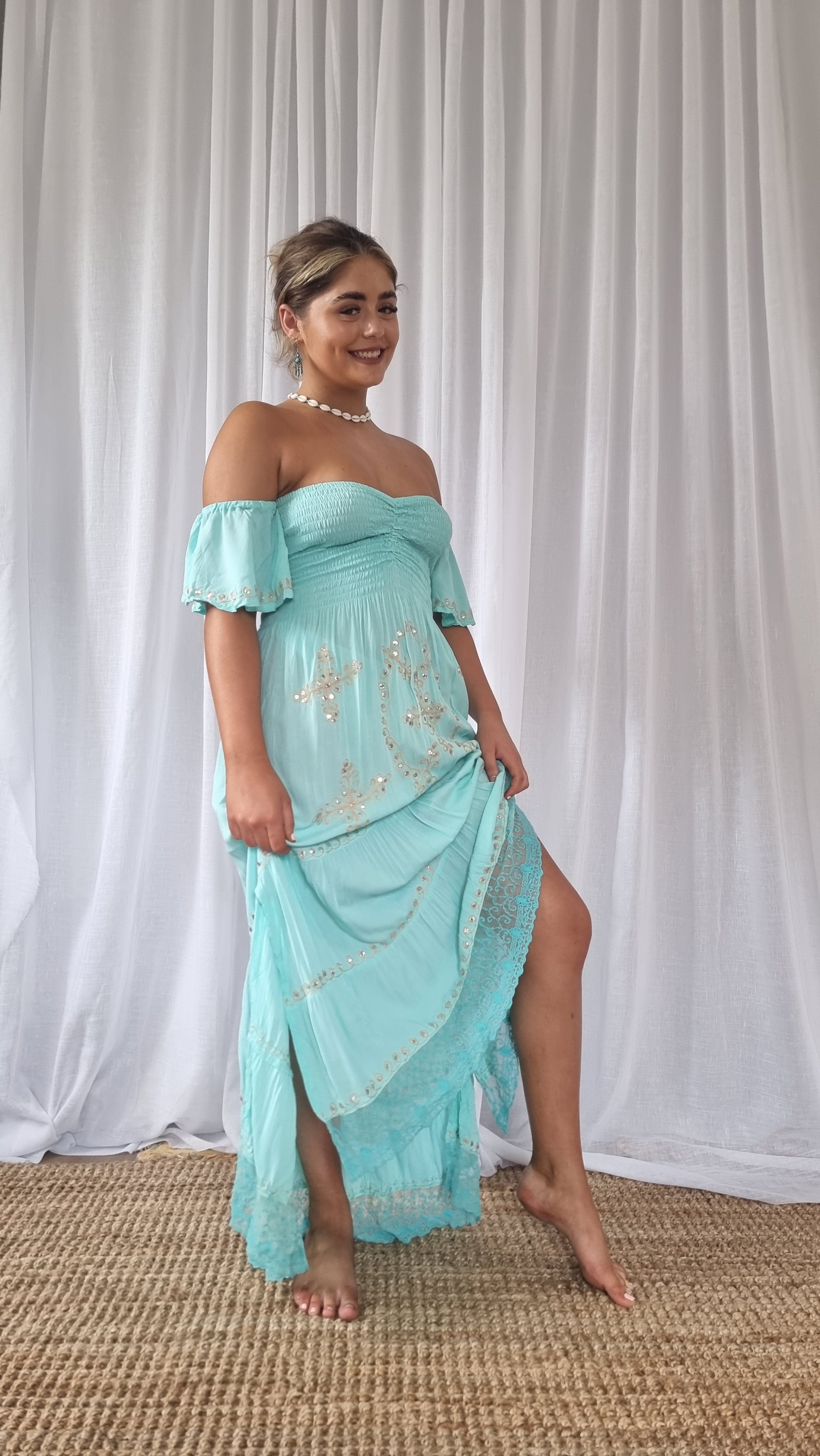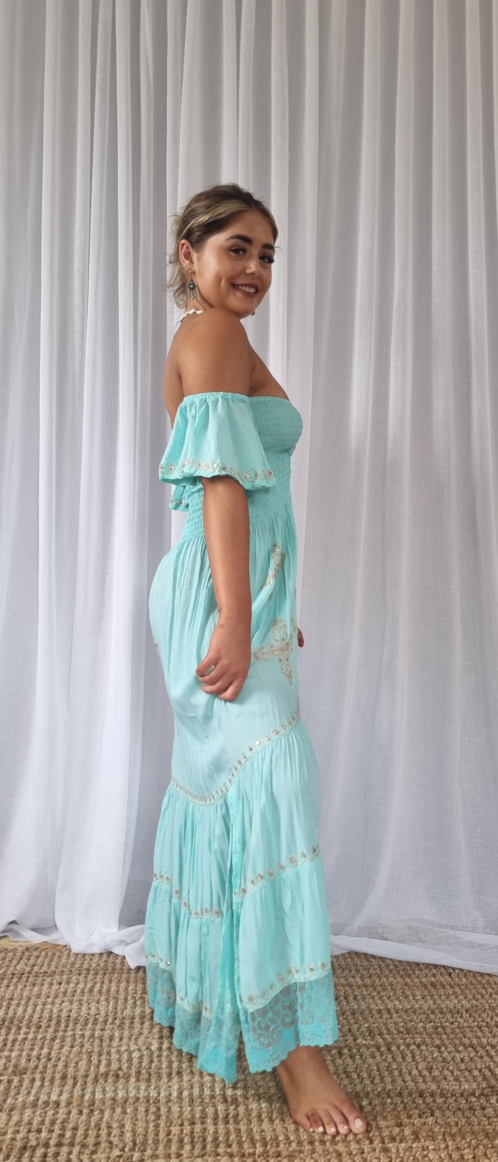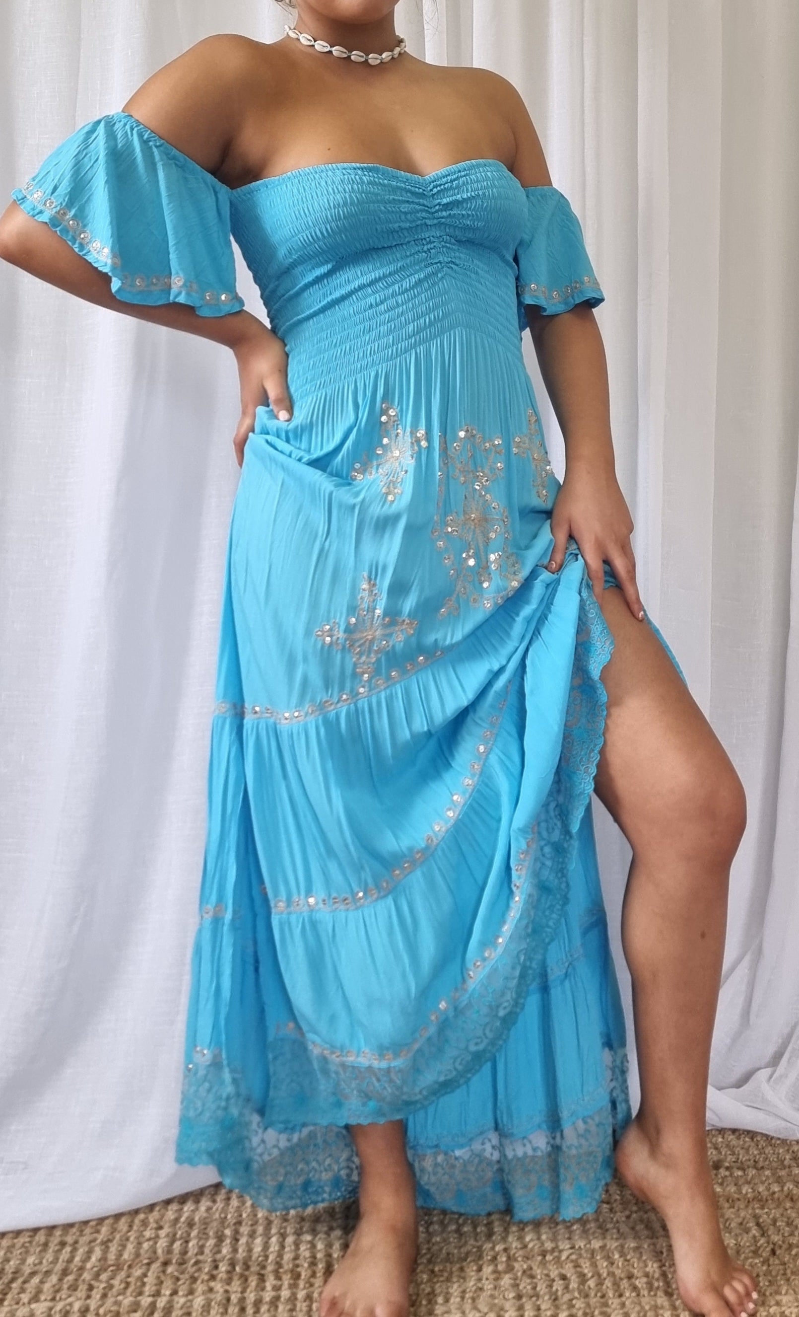 The Hem is lined with embroidery and sequenced on both the front and rear of the dress and sleeves.