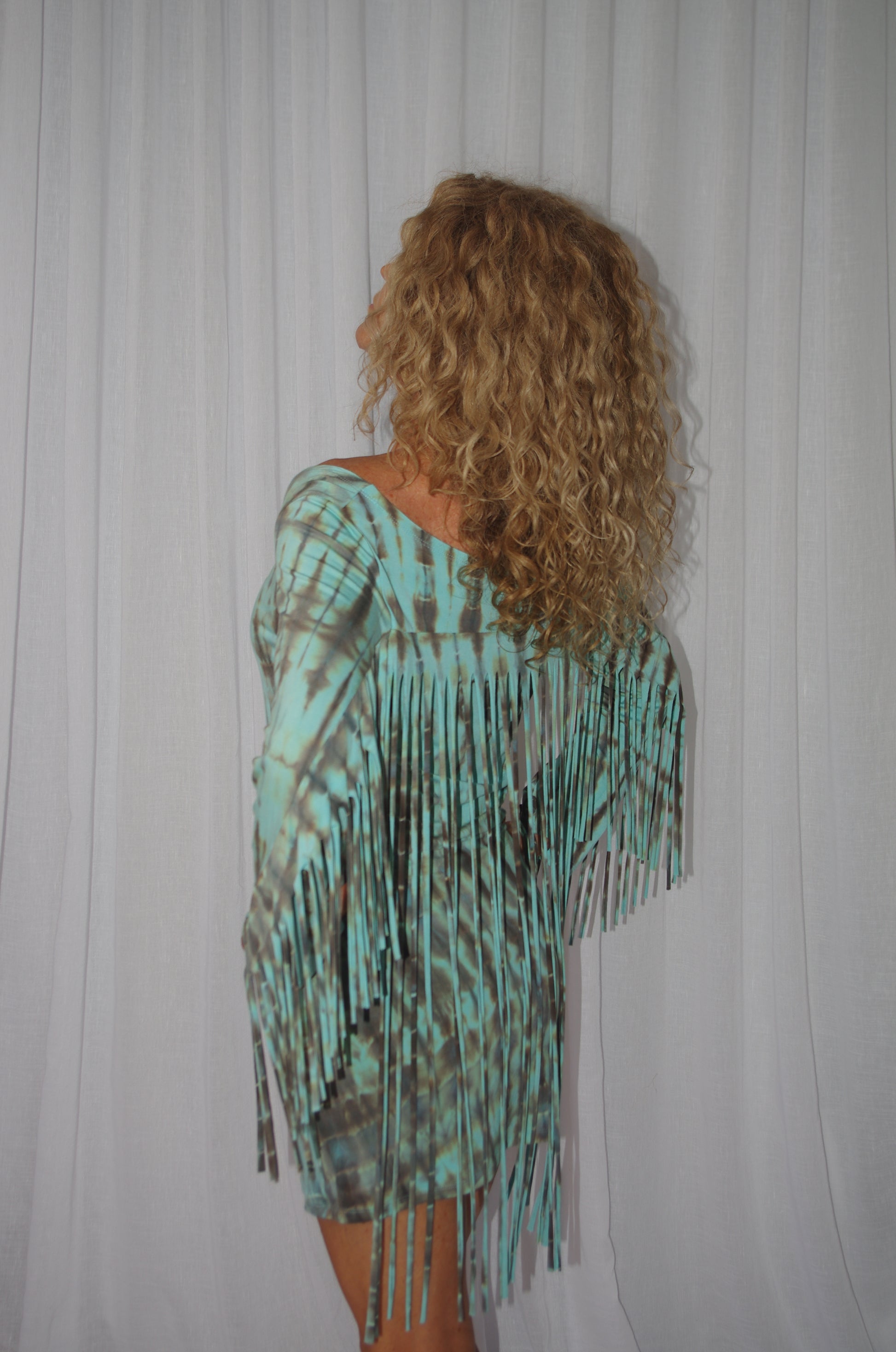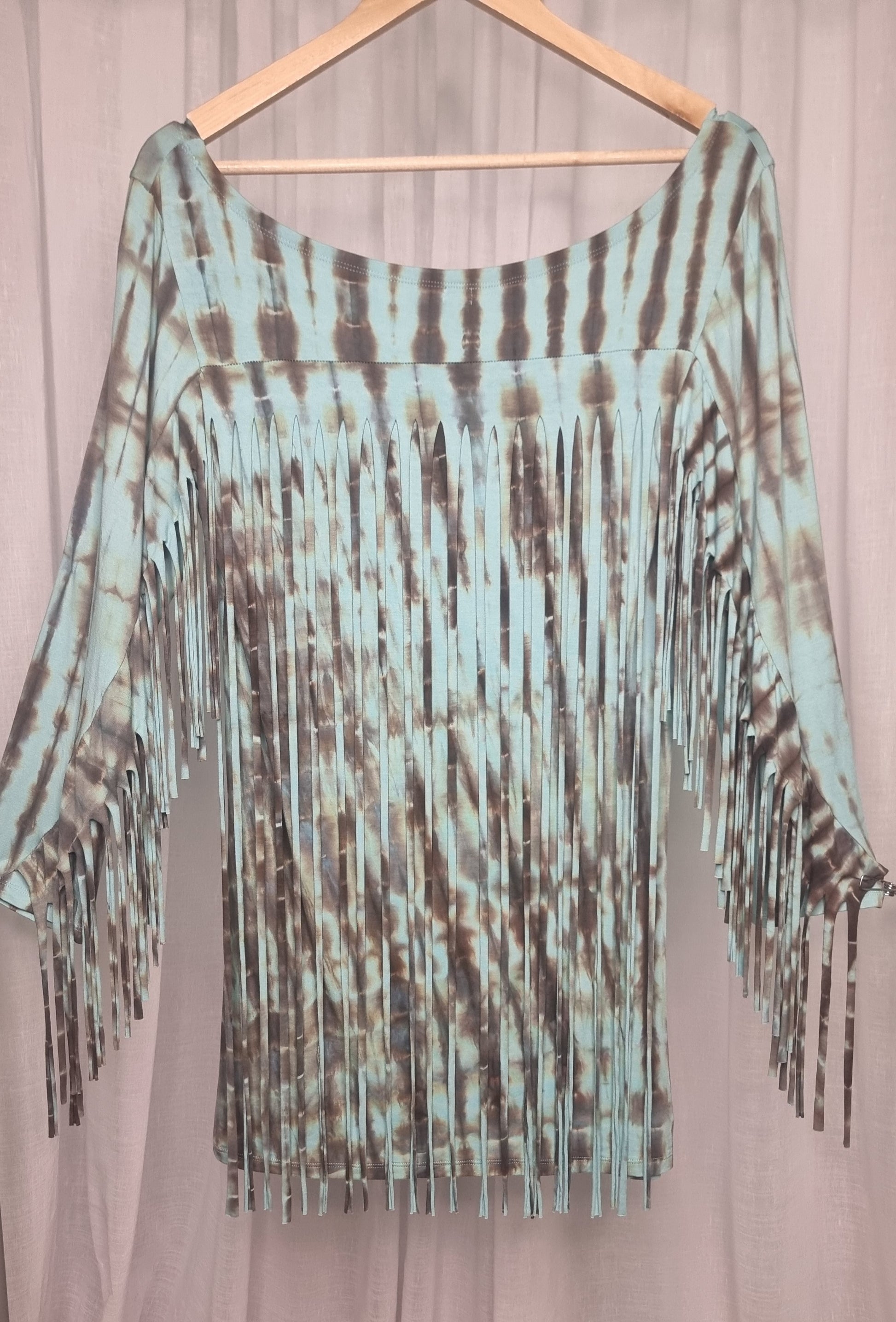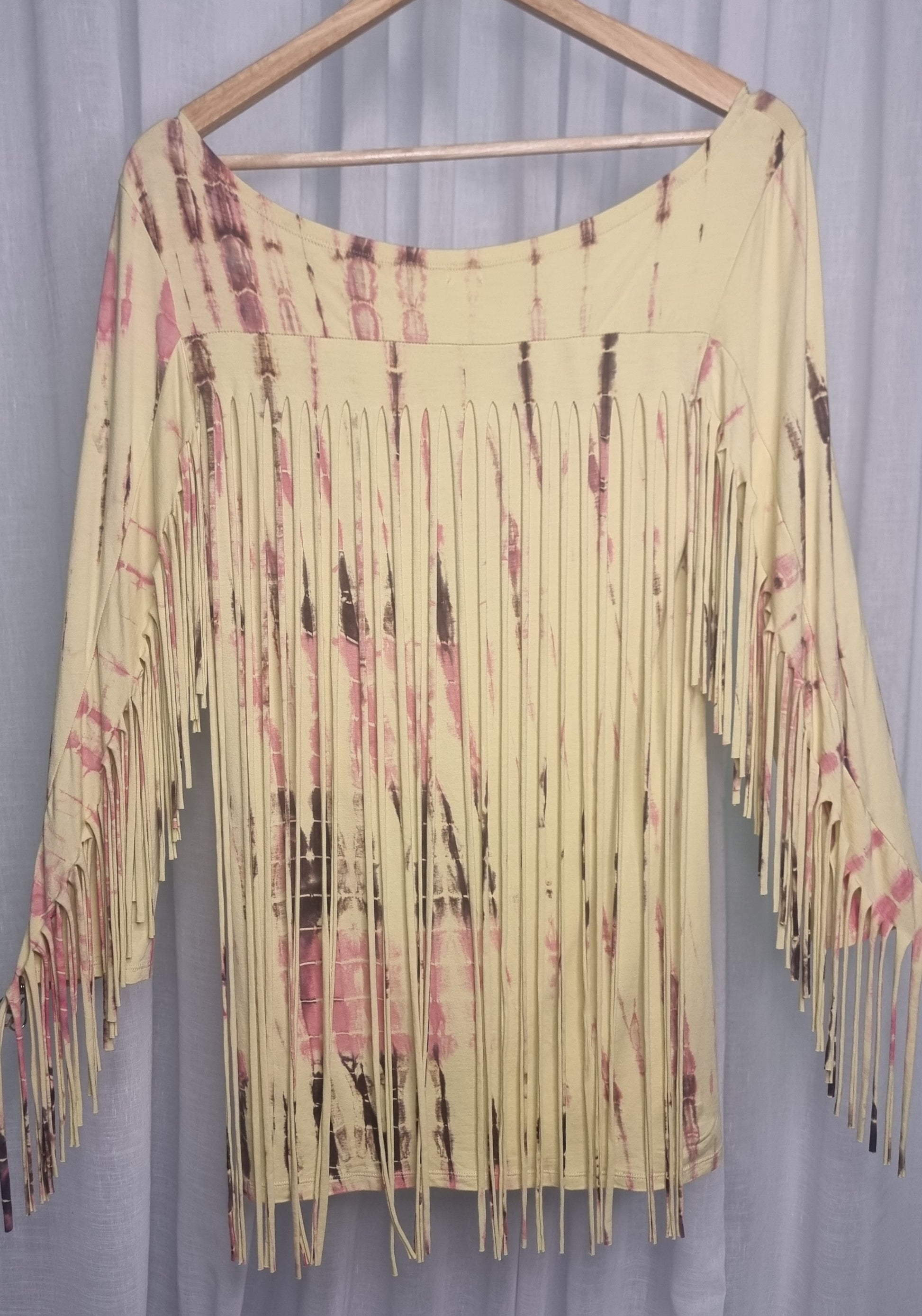 It has tassels hanging down across the back and along the arms to the wrist giving it a western, tribal, hippy, cowgirl feel.