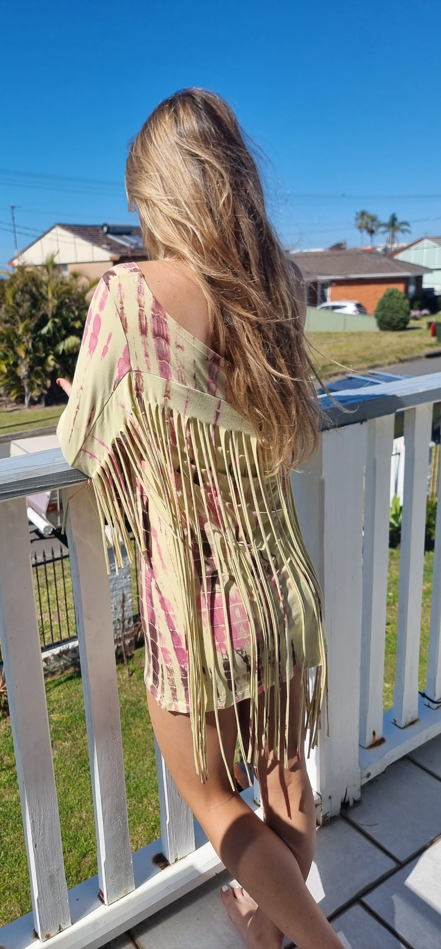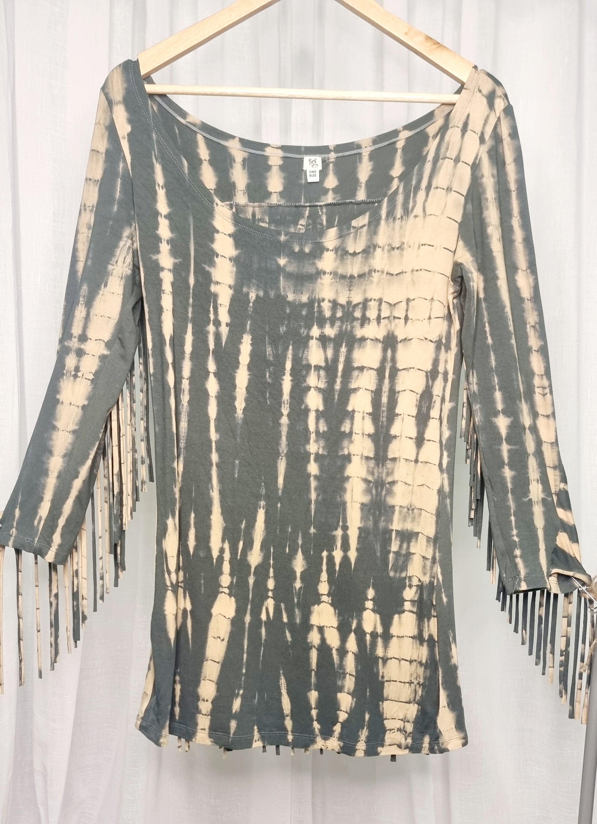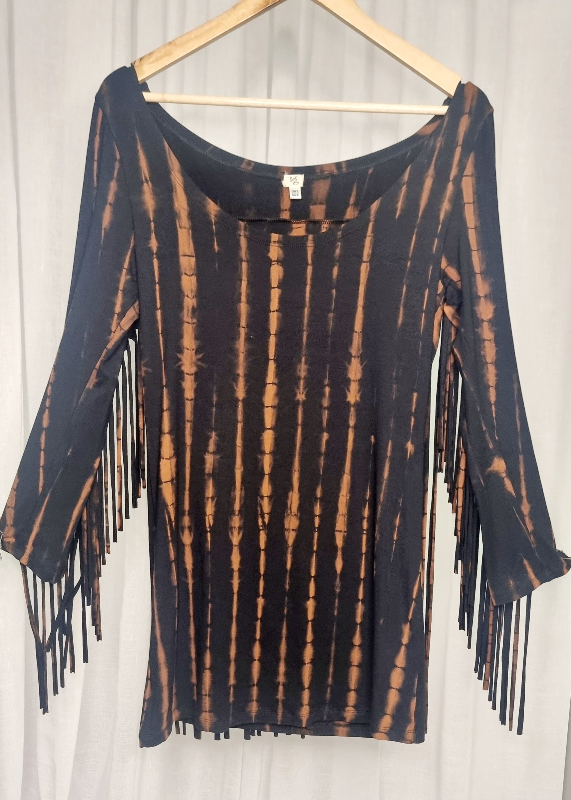 It has tassels hanging down across the back and along the arms to the wrist giving it a western, tribal, hippy, cowgirl feel.