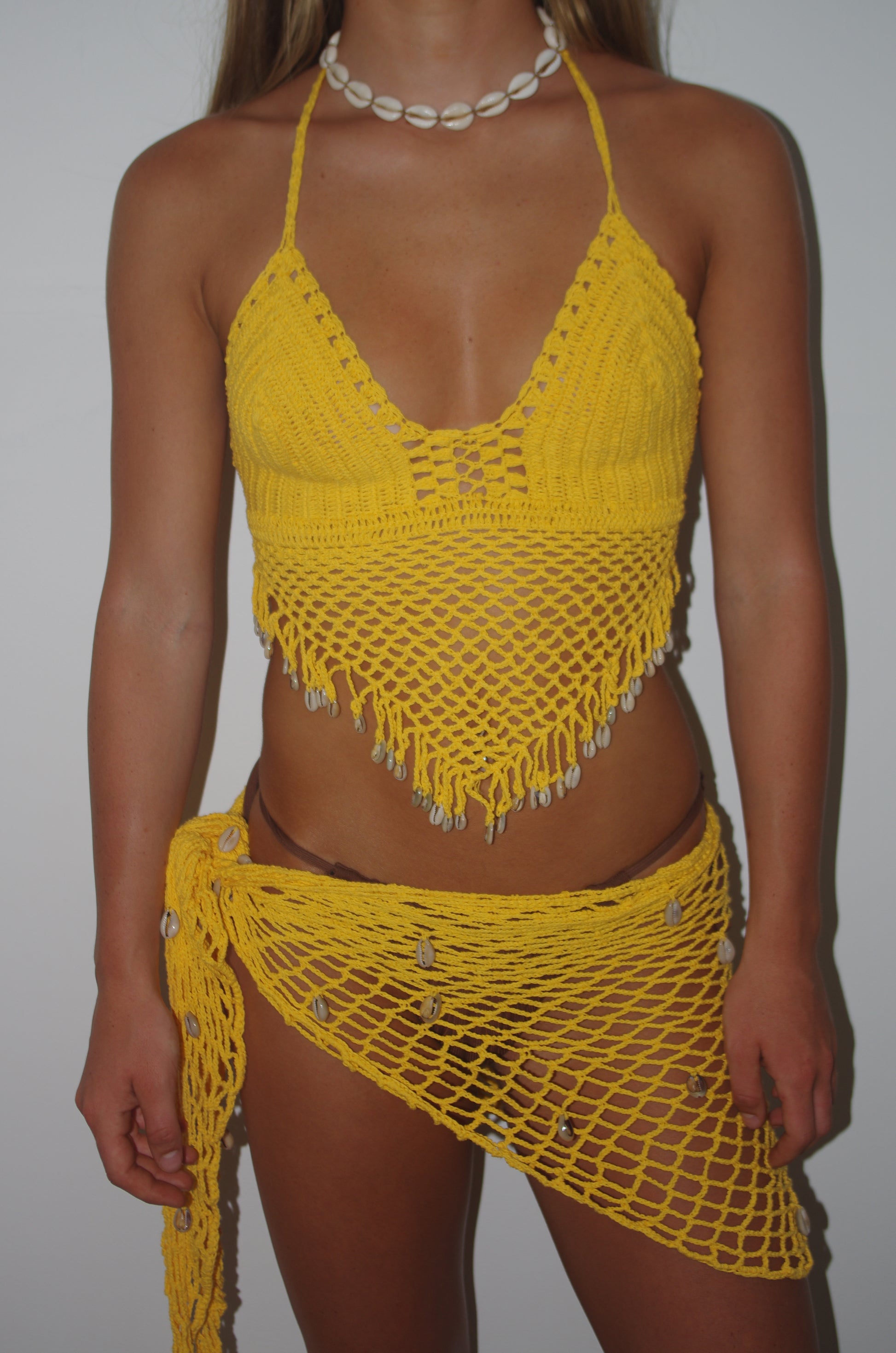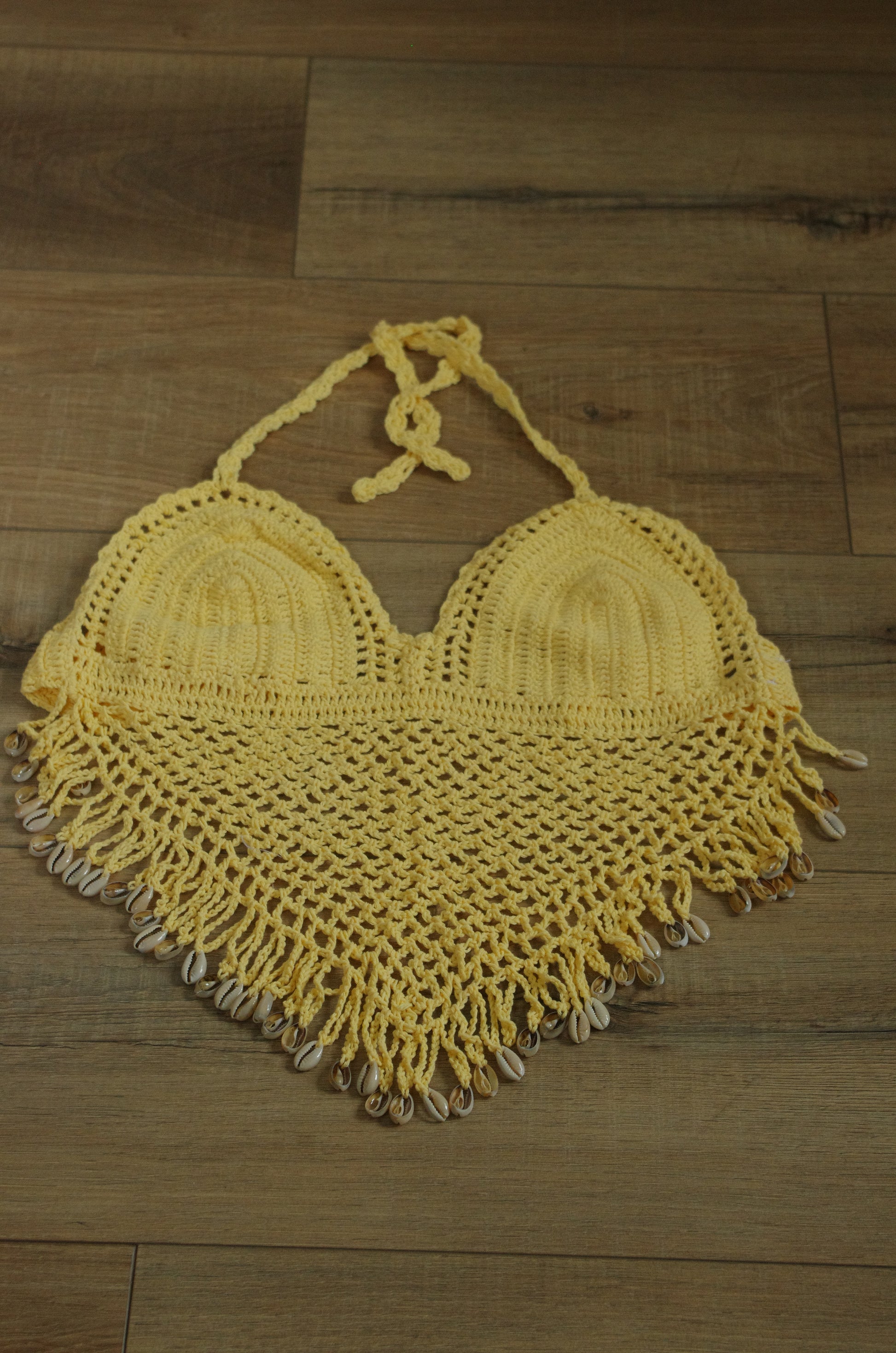 Hand Crochet V front CROP with shells lining both sides and 1 single tie at the back.